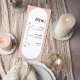 A graceful floral line drawing adds subtle romantic detail without overwhelming the clean layout. The structured course sections keep your meal presentation polished and easy to read, making this menu card a beautiful and functional addition to your place settings.