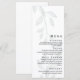 The delicate greenery branch creates a light, organic backdrop while the clean typography highlights each course of your meal in a timeless and stylish way. The balanced design allows your menu details to stand out while maintaining a calm, nature-inspired aesthetic that complements a wide range of wedding themes.