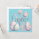 A sophisticated and minimalist digital illustration featuring the word "Easter" in a clean, grey serif font. The text is layered over a soft watercolor arrangement of tulips, patterned Easter eggs, and a small bunny silhouette. The color palette is muted with lavender, sage, and dusty rose tones.