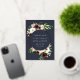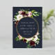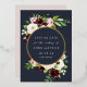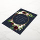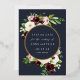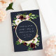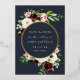 Un mariage élégant sauvez le design de date avec vos détails mariages centrés dans un cercle encadré de feuille d'or, avec une bordure de fleurs d'aquarelle luxuriante et de feuillage en bleu, ivoire, bordeaux et vert sur un riche arrière - plan bleu minuit.