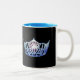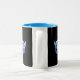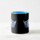 Une couronne bleue brillante à l'avant et au centre de chaque côté de cette tasse de café/cacao. Montré en tasse noire et blanche avec intérieur bleu. Customisez et personnalisez ou achetez comme prévu.