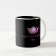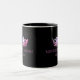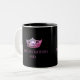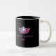 Une couronne rose brillante à l'avant et au centre de chaque côté de cette tasse de café/cacao. Montré sur une tasse noire et blanche avec un intérieur noir et coordonnant le texte rose. Customisez votre intérieur et personnalisez l'exemple de texte à votre place. Montré comme Miss Des Moines 1982.