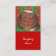 Un heureux chat tortois (qui ressemble à un pudding de Noël !) s'assied sur un coussin vert contre un arrière - plan aux feuilles saintes rouges et vertes. Modèle de carte de visite avec personnalisable pour vous de personnaliser avec votre propre texte, message ou images. Image créée à partir d'un dessin original au crayon coloré.