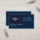 Ce modèle de carte de visite personnalisée est affiché en bleu marine avec un exemple de texte en blanc et a une impression de couronne de concours. Customisez et modifiez les informations de l'échantillon à votre place.