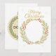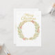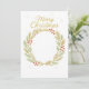 Carte de Noël festive avec une couronne de pin dorée, des baies rouges et des espaces réservés pour 2-3 photos. Écriture dorée élégante ‘Joyeux Noël’ avec des accents de flocons de neige. Carte de vacances moderne parfaite.