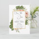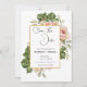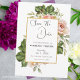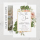 Cette élégante carte de faire-part de mariage comporte un encadré doré avec une rose aquarellée et une branche de verdure comme fond de modèle. Les mots « Sauvegarder la date » sont écrits en police noire sur fond blanc. Le nom du couple, la date et le lieu du mariage sont également inclus en police noire sur fond blanc. Une photo élégante du couple est ajoutée à la carte avec leurs noms et la date et le lieu du mariage écrits en dessous.