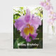 Vous recherchez des cartes d'anniversaire personnalisées ? Ces modèles de cartes de voeux ont un accueil avant et un sentiment intérieur que vous pouvez facilement changer. Le modèle est déjà configuré pour vous. Remplacez simplement l'exemple de texte par le vôtre. La façade de la carte présente une belle fleur d'orchidées de cattleya. Cette fleur tropicale a des pétales violets et une gorge jaune. Fait une jolie carte pour un amoureux des fleurs, des fleurs tropicales, des orchidées ou de la nature. Le message d'entrée dit : "Joyeux anniversaire." A l'intérieur dit, "Passez une journée merveilleuse et spéciale." Vous pouvez modifier ces messages si vous le souhaitez pour créer une carte personnalisée. La police est assez cursive. Cliquez sur le bouton personnaliser pour modifier la police si vous le souhaitez.