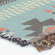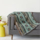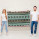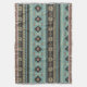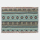 Un motif inspiré des couvertures amérindiennes / tribales présente des dessins géométriques. Palette : marron, orange, bleu ciel et blanc crème.