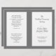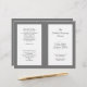 Programmes de cérémonie mariage gris foncé et blanc avec zones de modèle texte pour accueillir une cérémonie catholique plus longue. Une police noire et élégante est imprimée sur des panneaux blancs à l'avant et à l'arrière. Plier en deux après réception qui mettra l'écriture et le message de remerciement à l'arrière du programme. Au verso (qui sera le centre des pages du programme) inclure l'ordre de la cérémonie et la section de la fête de mariage pour énumérer toutes les personnes impliquées dans rendre la journée si spéciale. Bien que cet exemple de programme soit mis en place pour un service catholique, utilisez-le pour n'importe quel type de mariage. Ajoutez des espaces pour améliorer la formulation.