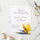 Programme de mariage plat pour oiseaux de paradis modèle pour une petite cérémonie intime. Montré sur du papier écru feutré amélioré, ce joli papier à lettres floral est imprimé sur les deux côtés. Pour réduire le prix, choisissez un papier de base ! Une grande fleur tropicale d'oiseau de paradis, jaune vif, orne l'avant. Le texte violet foncé est facile à personnaliser avec un titre, les noms du couple et la date et l'emplacement de la cérémonie. Au verso figurent l'ordre de la cérémonie et les noms de l'officiant, du musicien, du mariage et des noms de famille que vous choisissez. Cette carte plate est une plus grande taille 6x8, ou choisissez une autre. Ça fait un merveilleux souvenir de ce jour spécial.