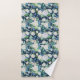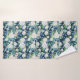 Belle serviette de bain à motifs floraux blanc et bleu posée sur un arrière - plan bleu marine.