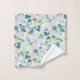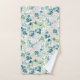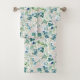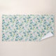 Belle serviette de bain à motifs floraux rose blanche posée sur un arrière - plan blanc aux feuilles vert clair.