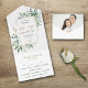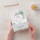 Ce joli faire-part de mariage de toute saison avec la carte RSVP déchirante combine des images d'aquarelle élégantes de feuilles bleu vert avec la typographie moderne. Le cadre doré intérieur est agrémenté de feuilles doux, et le rabat extérieur montre votre propre photo. Votre texte personnalisé est une combinaison de script manuscrit et de polices traditionnelles en or et bleu vert, et il ya beaucoup de champs pour vos informations. Si vous n'avez pas besoin d'un champ de texte, videz-le. Nous sommes toujours heureux d'aider, alors n'hésitez pas à nous envoyer un message si vous avez besoin d'aide. Si vous avez une réception sous forme de buffet, nous pouvons travailler avec vous pour reconcevoir la partie RSVP, alors n'hésitez pas à demander !