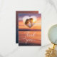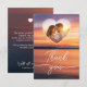 Cette carte de remerciements chaleureuse présente une photo de Destei au coucher du soleil dans les tons orange et violet. L'avant comprend une zone de photo en forme de coeur pour votre photo préférée de mariage ou de couple avec un élégant texte "Merci" en dessous. Le dos offre de l'espace pour un message personnel, se terminant par "Avec tout notre amour" suivi de vos noms et d'un détail subtil du coeur ci-dessus. Une belle façon d'express votre gratitude avec une touche romantique et d'inspiration nature.