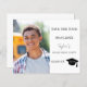On front: Add your own vertical size photo of the graduate. A chic white background, black text. Templates for a name and date. The name is written with a modern hand lettered style script. With a cap, tassel topper.