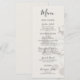 A wedding reception menu featuring a modern motif of a white rose on a ivory-colored background, complete with meal course selections, dessert and detailed descriptions.