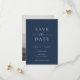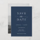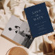 This wedding save the date card features a minimalist and modern style. The front has a clean Navy Blue background with classic White typography, combining bold serif fonts with a touch of script for a refined look. The back showcases a black-and-white photo of the couple with text overlay, creating a romantic and timeless design.