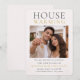 Modern new home design featuring neutral blush tones, bold serif typography, and a centered photo layout with gold accent text. Clean, photo-forward style suited for announcing a move and inviting guests to a housewarming gathering with a polished, contemporary look.