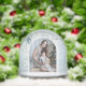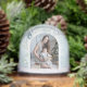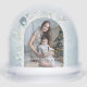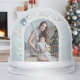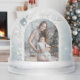 Elegant modern holiday design featuring your keepsake photo in an arch-shaped cutout template with opaque white border, abstract watercolor style light blue and white winter greenery and sparkles of white snow on pastel blue watercolor effect background. Includes editable text fields on front and photo template on back.
