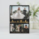 Moderne, élégant "Amour et merci" Gold Script 4 Photo Collage Black Mariage Carte de remerciements. Modèle minimaliste et élégant de carte mariage avec quatre (4) photos en grille sur le devant et une (1) photo sur le côté arrière. Texte "Amour et merci" dans une calligraphie lettrée à la main joli coeur swash queue script en or sur arrière - plan noir. Personnalisez avec votre nom et message de remerciement. Si vous avez besoin d'aide ou d'un article correspondant, veuillez contacter le concepteur !