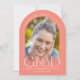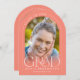 Ce faire-part de graduation en arc de corail simple minimaliste dispose d'une arche délicate cadre, 2 modèles photo et élégante typographie moderne.
