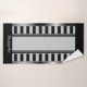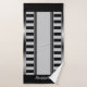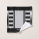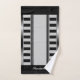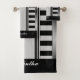 Un ensemble unique mais simple de serviette de bain avec des rayures noires fines verticales et horizontales larges avec une bordure en argent à gauche et à droite. Monogrammé avec un nom initial et un nom de script pour votre personnalisation. Customisez les détails.