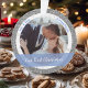 Splashy mais élégant Notre premier Noël en tant que M. et Mme. [Nom de famille] ornement de Noël photo personnalisée pour les jeunes mariés, avec typographie moderne cursive / lettrage à la main sur un élégant ruban bleu semi-transparent, un cadre de flocons de neige blancs et argentés et de petites étoiles, et un autre cadre de parties scintillant en argent simulé. Assurez-vous de personnaliser au moins les deux photos (avant et arrière), le nom de famille sur le devant, les prénoms et l'année sur le dos.
