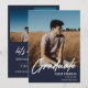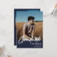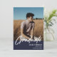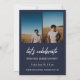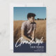 Écriture blanche moderne superposition "Graduate", faire-part d'obtention d'un diplôme de haute classe de photo et invitation en bleu marine. Lignes modèles pour le nom du diplômé, la classe de l'année et l'école. Le dos de la carte comporte 2 espaces photo supplémentaires avec des lignes de texte pour les détails de votre fête d'ouverture/remise des diplômes.