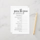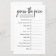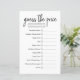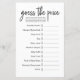 Ajoutez du plaisir et du rire à votre baby shower avec cette feuille de jeu moderne "Guess the Price". Doté d'un design simple et propre, ce jeu invite les clients à deviner le coût de l'essentiel pour bébé populaire comme les couches, les bouteilles, les lingettes, et plus encore. Parfait pour divertir les clients, cette carte de jeu est facile à jouer et fonctionne bien pour n'importe quel thème — genre neutre, classique ou baby showers modernes. Un grand brise-glace et les articles sont des cadeaux utilisables supplémentaires pour la future maman.