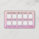 Ce carte de visite a un design chic en dégradé de demi-teintes rose avec typographie sans-serif, et dispose d'un système de récompense classique à l'arrière pour les clients de retourner recevoir quelque chose, c'est-à-dire remise, article gratuit, etc. Remplissez les détails avec le nom de votre entreprise, le type de service, le numéro de téléphone, le site Web, l'adresse et le code qr, et ajoutez les heures de magasin, le message et les informations de récompense personnalisées au verso.