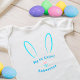 C'est un body adorable pour célébrer la première Pâques de votre bébé. Deux motifs de chaque côté. Sur le devant, une paire d'oreilles de lapin bleues mignonnes, un nez en forme de cœur rose et des dents de devant amusantes. Un texte qui dit "Ma 1ère Pâques" en bleu. Ce body pour bébé est facile à personnaliser, il suffit d'ajouter le nom de votre enfant en bas. Au dos, un autre motif mignon représentant un œuf coloré de Pâques et le texte "Joyeuses Pâques 20XX", vous pouvez ajouter l'année de la première Pâques de votre bébé. De plus, en bas, ajoutez le nom de votre enfant pour le rendre unique. C'est le cadeau idéal pour la tenue de votre bébé pour sa première Pâques !