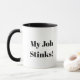 Les travailleurs de l'assainissement ou les poubelles ne sont pas vraiment appréciés tant qu'ils ne ramassent pas les poubelles. Non seulement leur travail traite avec des canettes puantes, mais il pue qu'ils n'obtiennent aucun crédit ou sont souvent même pas vus parce qu'ils viennent pendant que vous dormez ou au travail. Cette tasse est pour tous ces gars qui ramassent nos ordures. Il présente un éboueur avec le texte "My Job Stinks" comme le texte. Vous êtes libre de mettre aussi un nom ou tout autre que vous voulez. Cela fait un grand cadeau pour le type que vous connaissez qui est un éboueur. Conçu par Sheila Cicchi, Brownielocks.com, Tous droits réservés.