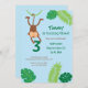 Cette invitation d’anniversaire mignonne et colorée est idéale pour célébrer le troisième anniversaire de votre fils. Il comporte un personnage de singe accroché à un brach et portant le numéro d'anniversaire. Les Feuilles décorent la frontière. Ce design ludique est parfait pour un enfant actif qui aime s'amuser.