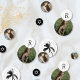 Ce confetti photo est parfait pour un bar à sucreries Bat mitzvah, table de desserts, table à bougies et plus encore. Le design comprend un palmier noir et blanc, une lettre monogramme, une étoile de David, et trois photos de votre fille Bat mitzvah. Entrez l'outil de design Zazzle pour ajuster le placement de la photo.