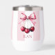 Un arc rose avec cerises, coquette esthétique tondeuse à vin thermique avec rayures arrière - plans rose et blanc. Grand cadeau pour les demoiselles d'honneur, les femmes. Monographie avec son nom ou ses initiales.