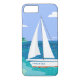 Monogram Voilier Côtier Tropical iPhone 7 Coque. Un voilier avec votre nom sur elle s'approche d'une plage. Vue sur la mer tropicale. Bleu, turquoise, mousse de mer, turquoise, vert, blanc. Absolument unique.
