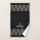 Personnalisez ces noir et serviette de main argentée de Netilat Yadayim de monogramme pour le lavage rituel des mains comme cadeau pour Purim, pâque ou n'importe quelle occasion de vacance ou spéciale. L'arrière - plan de noir comporte une double rangée des symboles d'étoile de David de parties scintillantes d'argent de faux le long des deux bords courts. Votre initiale facultative de monogramme dans une police décorative grise argentée molle est recouverte avec votre nom, aussi facultatif, dans les caractères gras blancs et simples croquants sur un bord de la serviette de main. Pour votre propre famille, comme souvenirs ou en tant que cadeaux spéciaux uniques, ces serviettes rituelles personnalisées de Netilat Yadayim avec le motif de Magen David de parties scintillantes d'argent de faux feront une belle présentation.
