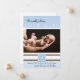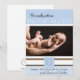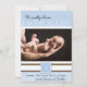 Ce précieux design de faire-part bébé est une façon merveilleuse de célébrer votre nouvelle arrivée. Cette conception a un arrière - plan bleu clair bloqué avec des rayures blanches et brunes. Dans le centre est un endroit pour votre photo personnalisée de votre fils. En haut, il dit : Nous sommes fiers d'accueillir et le nom de votre bébé. Sous la photo il y a un endroit pour son premier monogramme initial. En bas, il y a une place pour le nom de votre bébé, les statistiques de naissance, et le nom du parent.
