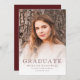 Ce faire-part de remise de diplômes photo présente la photo du diplômé avec une superposition de texte bordeaux. Le mot "diplômé" apparaît dans la typographie décorative des contours. Ajoutez le nom du diplômé, l'école et la classe année ci-dessous. L'arrière est ornée d'une élégante crête vintage entourant une initiale en monogramme blanc sur un arrière - plan bordeaux, ainsi que d'une pièce de texte mettant en évidence les réalisations et les plans du diplômé.