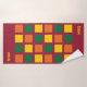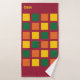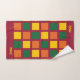 Serviettes de bain Monogram colorées et élégantes avec carrés géométriques en jaune, vert et orange, contre un arrière - plan bordeaux. Il existe un monogramme personnalisable, que vous pouvez remplacer par vos propres initiales ou nom. Ajout moderne à votre décor de salle de bain. Des éléments correspondants sont disponibles.