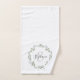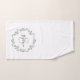 Cette conception comporte une couronne de feuillage aquarelle dans les tons vert sauge et gris. Personnalisez le texte à l'intérieur de la couronne avec un nom dans la calligraphie de style d'écriture manuscrite gris/noir fusain et un monogramme initial dans le type de serif ouvert gris clair.