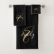Monogramme en or noir moderne Nom du script Serviette de bain chic Set pour elle. Initiale et nom monogramme. Typographie de script contemporaine. Noir or et blanc. Modifiez facilement la couleur arrière - plan ou la couleur du texte, si vous le souhaitez. Un cadeau branché pour elle pour les femmes. Recherchez la papeterie monogrammée de nom initial, les cartes à note, les cartes plates, les cartes pliées, les cartes postales, les autocollants, les étiquettes d'adresse de retour, les étiquettes de bagages, la serviette de plage, la serviette de golf, les balles de golf, la bouteille d'eau en acier inoxydable, le dos pour adulte, les sacs fourre-tout, la cuisine et les accessoires de salle à manger tels que les dessous de verre, les sets de table en tissu, serviettes, serviettes et serviettes serviettes de bain, rideau de douche, tapis de bain, etc. Step by Step Inspiration Series disponible exclusivement sur Zazzle à l'adresse zazzle.com/store/KrisHarty, conçu par le designer international Kris Harty. © 2022 Kris Harty Inspiration pas à pas