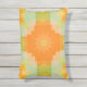 Coussin avec un motif moderne géométrique dans une chaude orange ensoleillée, jaune et vert frais. Le texte monogramme est facultatif.