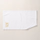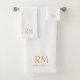 Un élégant ensemble de serviettes de bain minimaliste moderne avec nom or et initiales sur blanc.