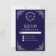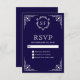Elégante carte RSVP avec une élégante bordure blanche ornée et un beau monogramme contre un arrière - plan bleu foncé.