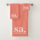 Cet élégant ensemble de serviettes minimalistes de typographie de corail de pêche est parfait pour une serviette de bain féminine subtilement indiquée.