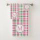 Ce mignon ensemble de serviettes de bain monogrammed dispose d'un motif classique en plaid dans les tons rose, vert et blanc. Personnalisez les monogrammes rose et vert correspondants avec votre choix d'initiales.