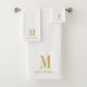 Nom monogramme d'or personnalisé et serviette de bain initiale sur blanc. Rafraîchissez votre décor de salle de bain avec un style typographique minimaliste.