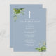 Cette élégante invitation de confirmation botanique bleu poussiéreux à l'eucalyptus peut être personnalisée avec vos informations en typographie chic avec des initiales monogrammes au verso. Conçu par Thisisnotme©