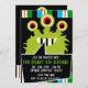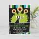 Un mignon monstre vert à trois yeux annonce une fête de bash d'anniversaire monstre sur l'invitation de la fête des enfants avec une bulle de discours bleu annonçant les détails de la fête. L'arrière - plan est à rayures vert, orange, noir, blanc et bleu turquoise. Le dos de l'invitation dit "Monster Birthday Bash" et présente la même créature mignonne. Customisez ces invitations de parties anniversaires de enfants en remplissant facilement le modèle vide fourni. Ou vous pouvez vous déchaîner avec les couleurs et les styles de police et déplacer les choses en utilisant le bouton "Customiser".